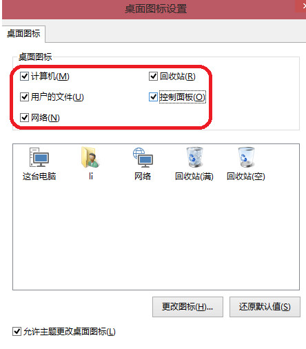 4、把計(jì)算機(jī)、用戶的文件、網(wǎng)絡(luò)、控制面板勾上