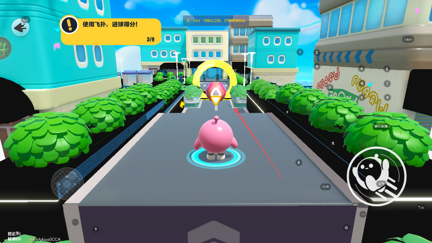 1、進(jìn)入游戲,看到提示使用飛撲,進(jìn)球得分,通過操控按鈕控制粉色蛋仔移動,靠近球后,點擊飛撲按鈕進(jìn)球。