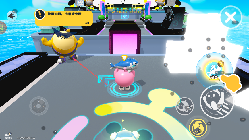 3、當(dāng)出現(xiàn)使用道具,擊落魔鬼蛋提示,拾取如咸魚等道具,點擊道具按鈕,向黃色魔鬼蛋發(fā)射道具,完成任務(wù)要求。