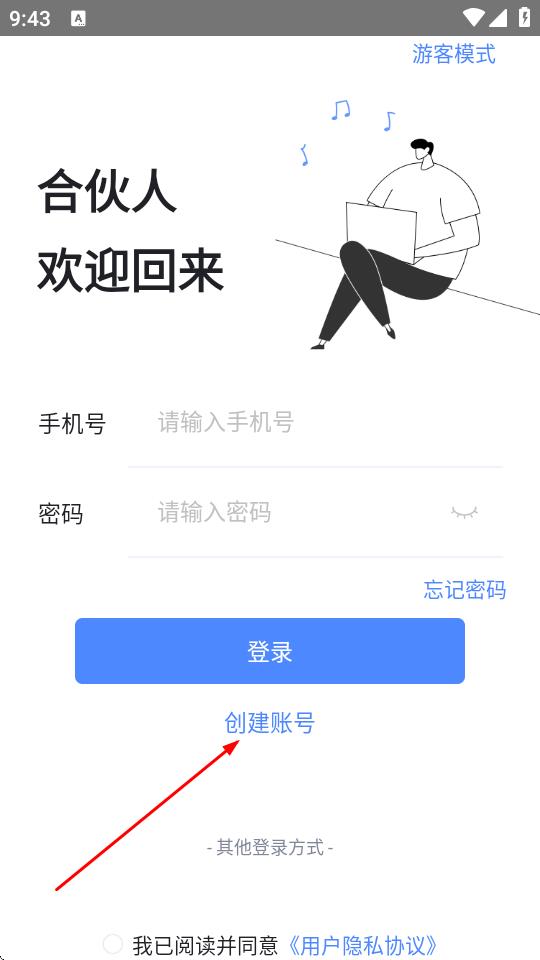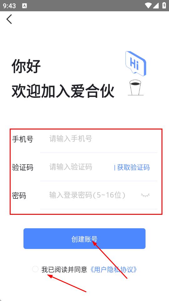 4、輸入手機(jī)號(hào),填寫驗(yàn)證碼,設(shè)置登錄密碼,勾選我已閱讀并同意用戶隱私協(xié)議,點(diǎn)擊創(chuàng)建賬號(hào),完成注冊(cè)后即可登錄。