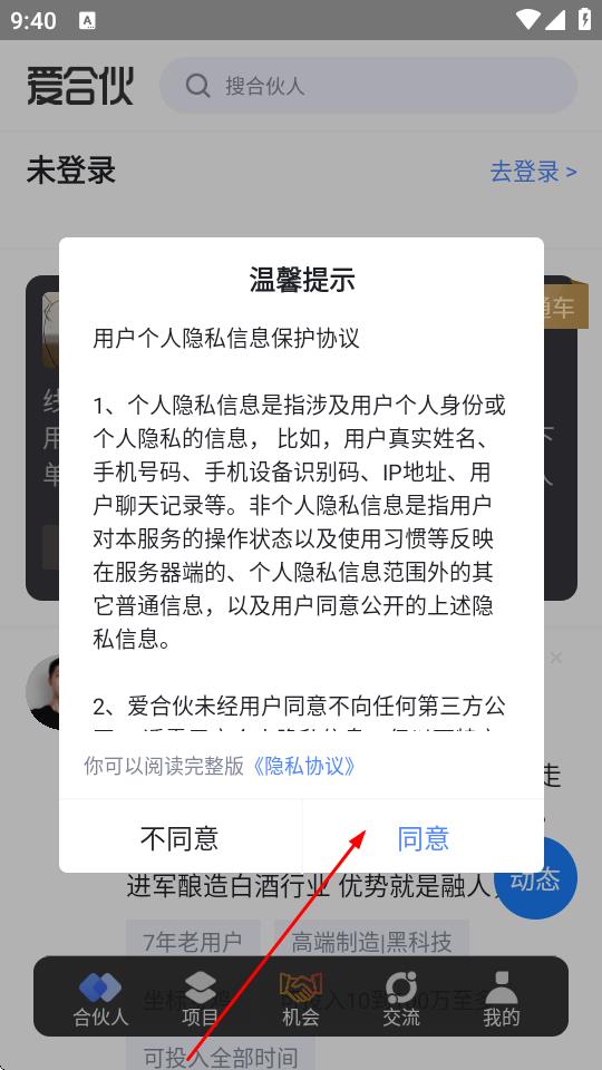 1、打開(kāi)愛(ài)合伙APP,在彈出的用戶個(gè)人隱私信息保護(hù)協(xié)議溫馨提示框中,點(diǎn)擊同意。