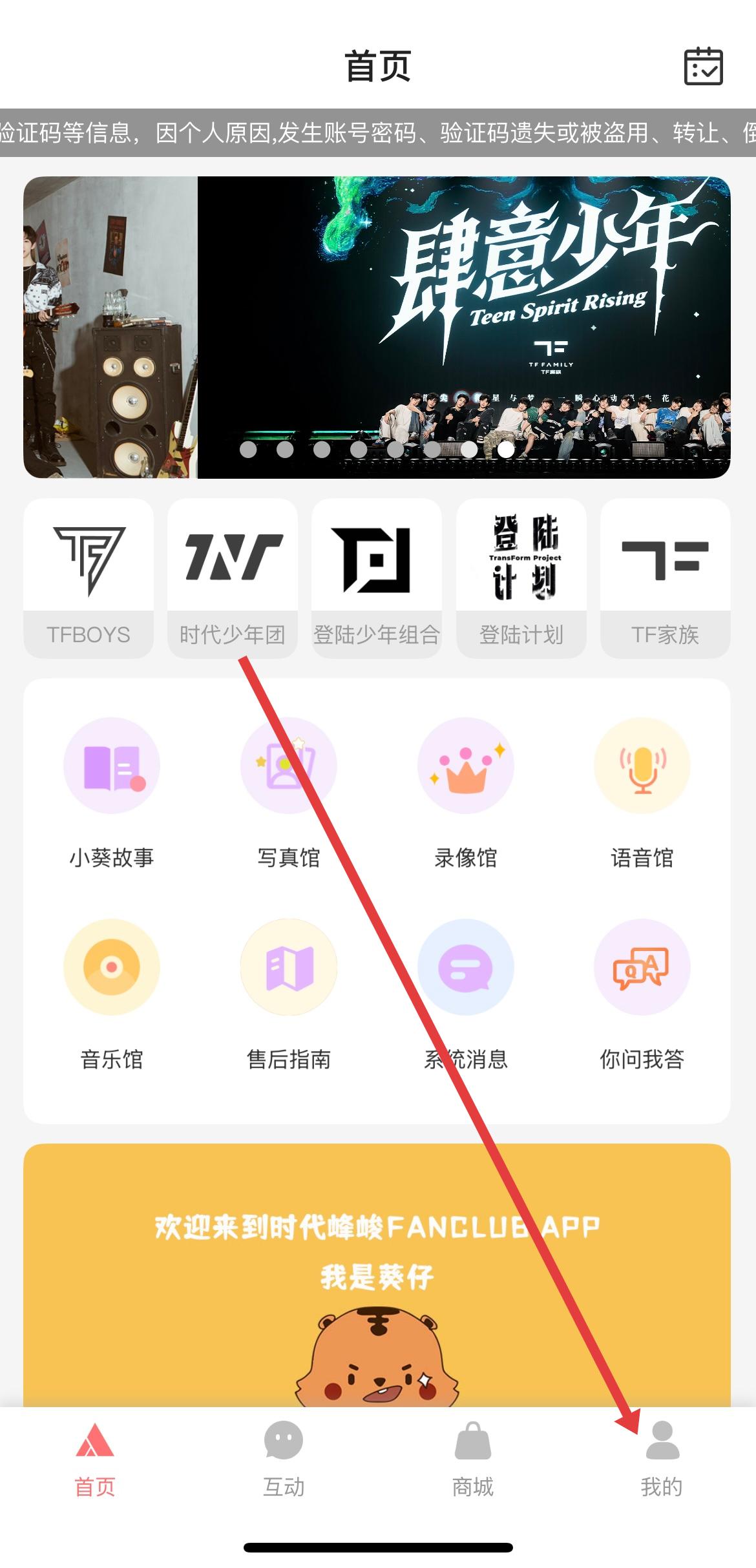 1、打開時代峰峻FANCLUB軟件,找到并點擊底部導(dǎo)航欄右下角的我的,進入我的頁面。