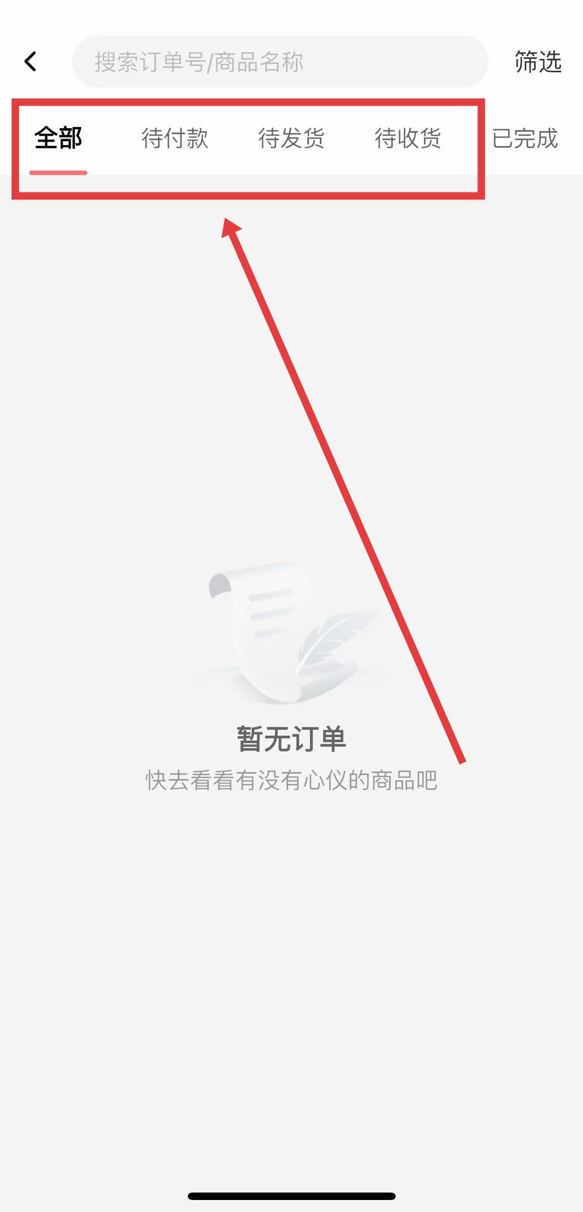 3、在訂單界面,根據(jù)需求點擊篩選查看不同狀態(tài)的購買訂單,來成功獲取商品的物流信息。