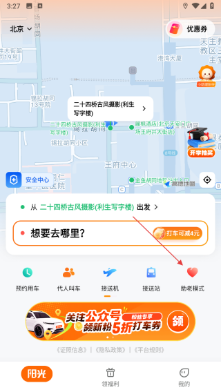1、打開(kāi)陽(yáng)光出行APP,在首頁(yè)點(diǎn)擊助老模式選項(xiàng),進(jìn)入助老模式界面。