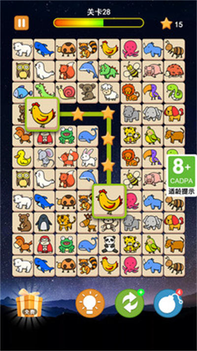 1、非常經(jīng)典的休閑游戲玩法,這里有很多不同的動物圖片,玩家需要將相同的兩張圖片毫無阻礙的連接起來就可以完成消除;