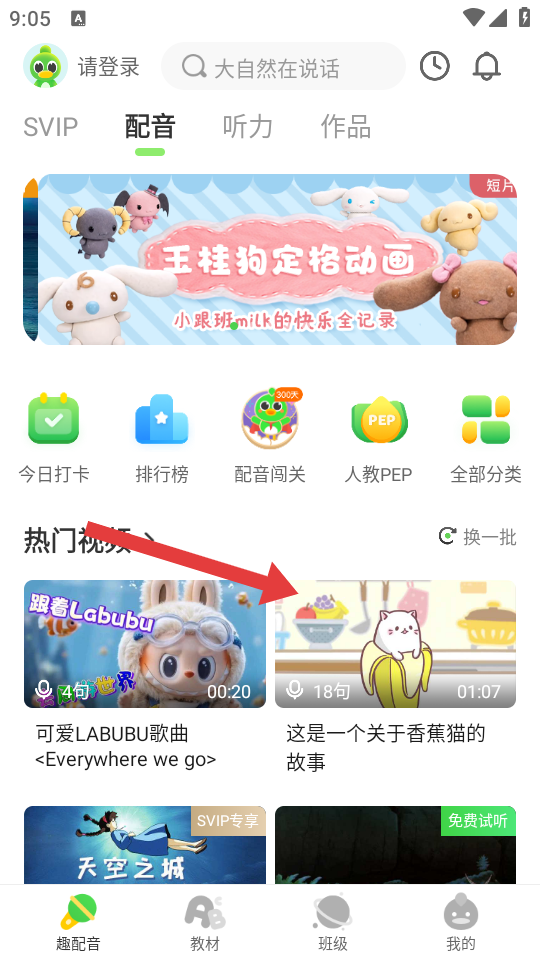 1、打開少兒趣配音,在主界面的熱門視頻區(qū)域,選擇要配音的視頻,點擊進入視頻詳情頁。