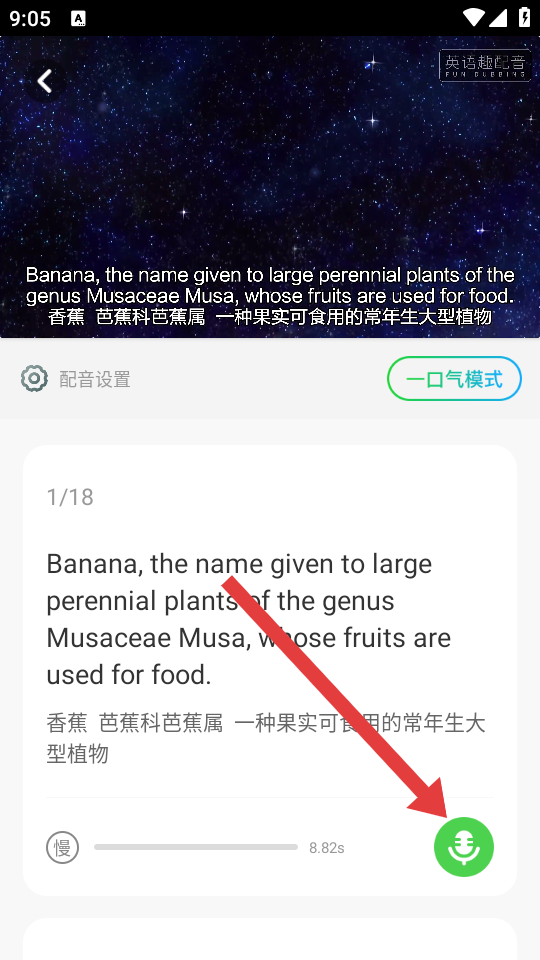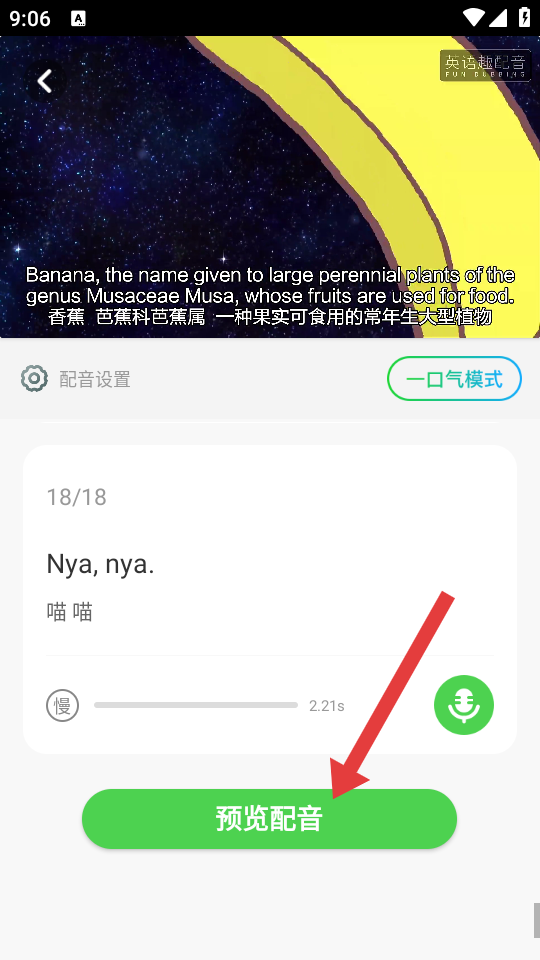 3、在配音界面中,點擊臺詞右側(cè)的綠色麥克風(fēng)按鈕,開始為當(dāng)前臺詞錄音,逐句完成所有臺詞的配音。