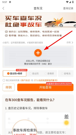 2、在查車況頁面,點擊加號圖標上傳行駛證或登記證,需含車輛識別代號VIN部分。
