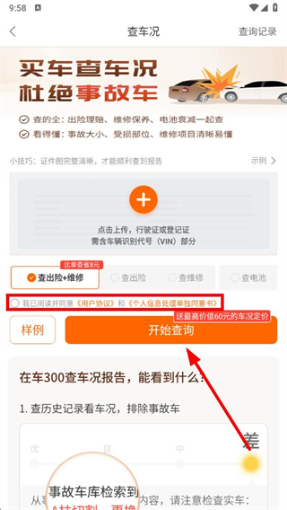 4、勾選同意協(xié)議后,點擊開始查詢按鈕,即可查詢歷史車況信息。