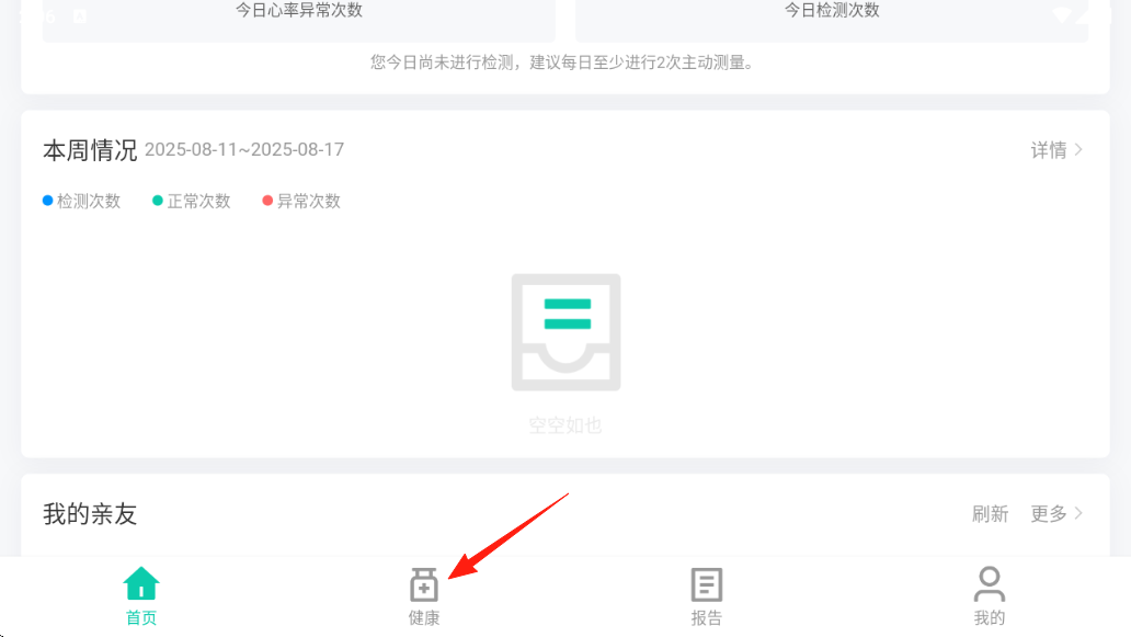 1、打開健康A(chǔ)PP進(jìn)入首頁,點(diǎn)擊底部導(dǎo)航欄健康選項(xiàng),跳轉(zhuǎn)頁面后在功能區(qū)域找到對應(yīng)檢測入口,按照頁面提示準(zhǔn)備好檢測條件,為后續(xù)檢測做準(zhǔn)備。