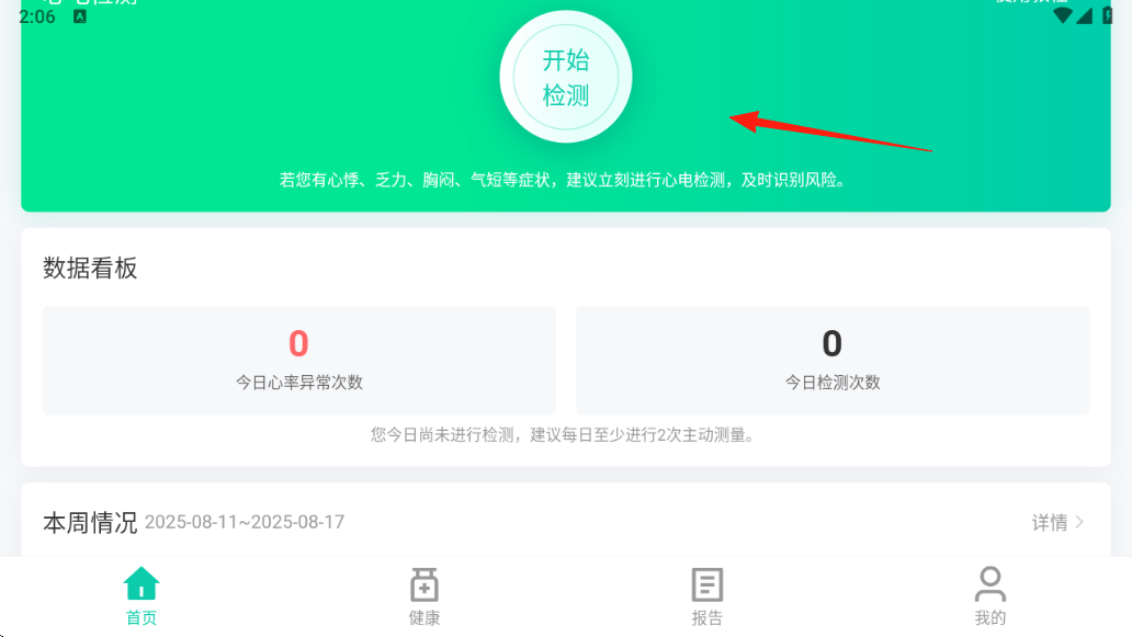 3、回到健康檢測頁面,點(diǎn)擊開始檢測按鈕,嚴(yán)格遵循檢測流程操作,保持穩(wěn)定狀態(tài)直至檢測完成,檢測結(jié)束后可在對應(yīng)頁面查看本次檢測結(jié)果及分析。