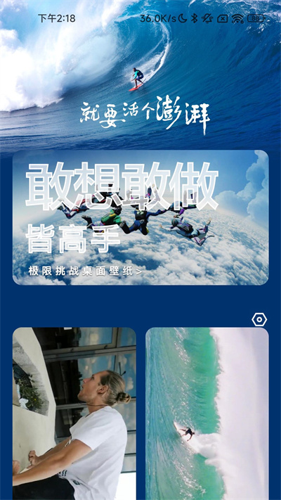 戶外運動在全民健身的浪潮中熱度猛漲,越來越多的敢于挑戰(zhàn)自我的運動愛好者不斷涌現(xiàn),充電高手為運動愛好者們設(shè)計了海量壁紙素材,打造激情澎湃的充電壁紙世界:高空跳傘、攀巖運動、街頭跑酷、滑雪沖浪,敢想敢做,你就是高手!