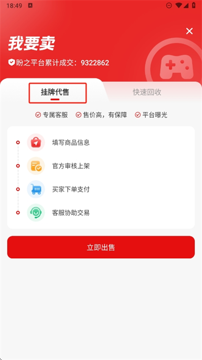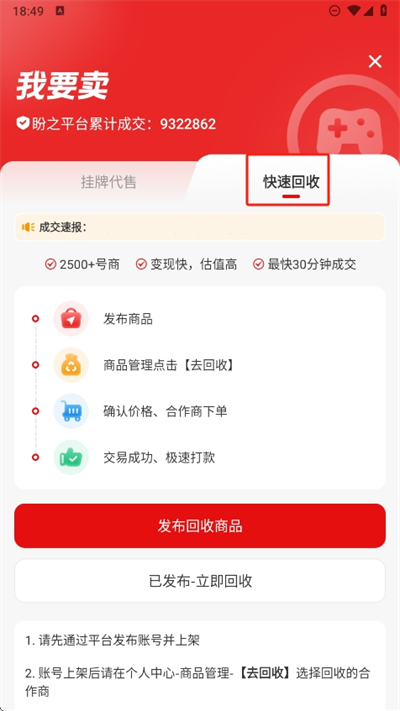 3、而快速回收是將自己的賬號(hào)可以直接進(jìn)行回收,發(fā)布后會(huì)有想要回收的用戶前來(lái)聯(lián)系自己進(jìn)行快速回收;