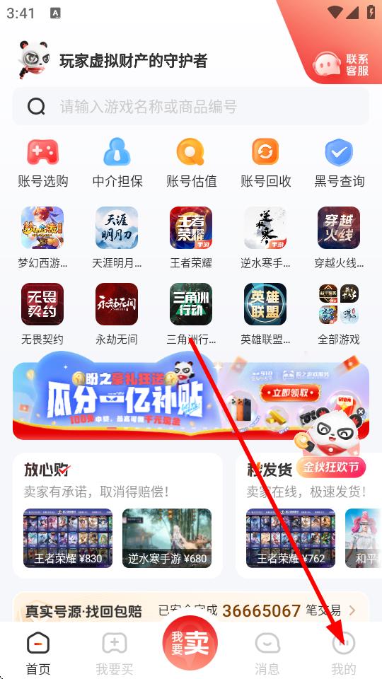 1、頁(yè)面中將會(huì)看到有超多的游戲賬號(hào)可以交易,如果你要賬號(hào)交易點(diǎn)擊中間這里進(jìn)入交易頁(yè)面;