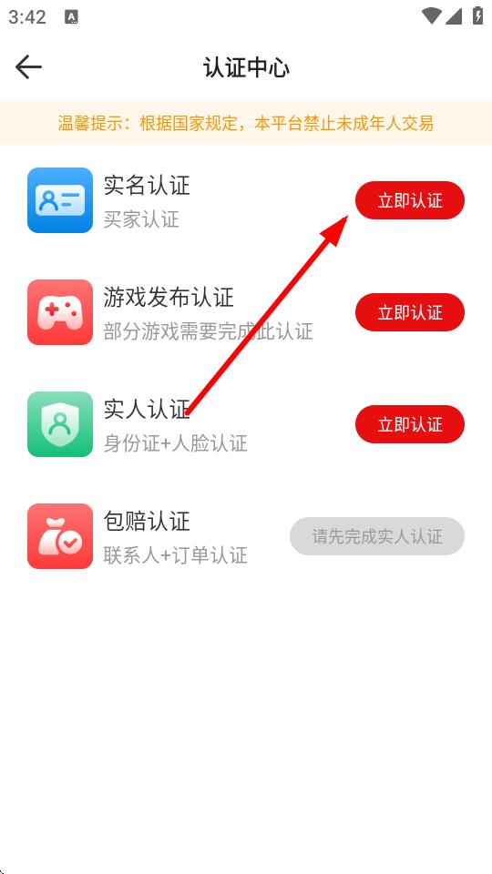 3、進(jìn)入認(rèn)證中心頁(yè)面后,點(diǎn)擊實(shí)名認(rèn)證右側(cè)的立即認(rèn)證選項(xiàng)。
