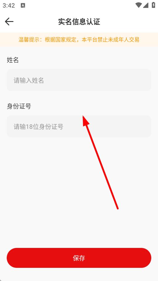 4、在實(shí)名信息認(rèn)證頁(yè)面,輸入姓名和身份證號(hào),點(diǎn)擊保存完成實(shí)名認(rèn)證。