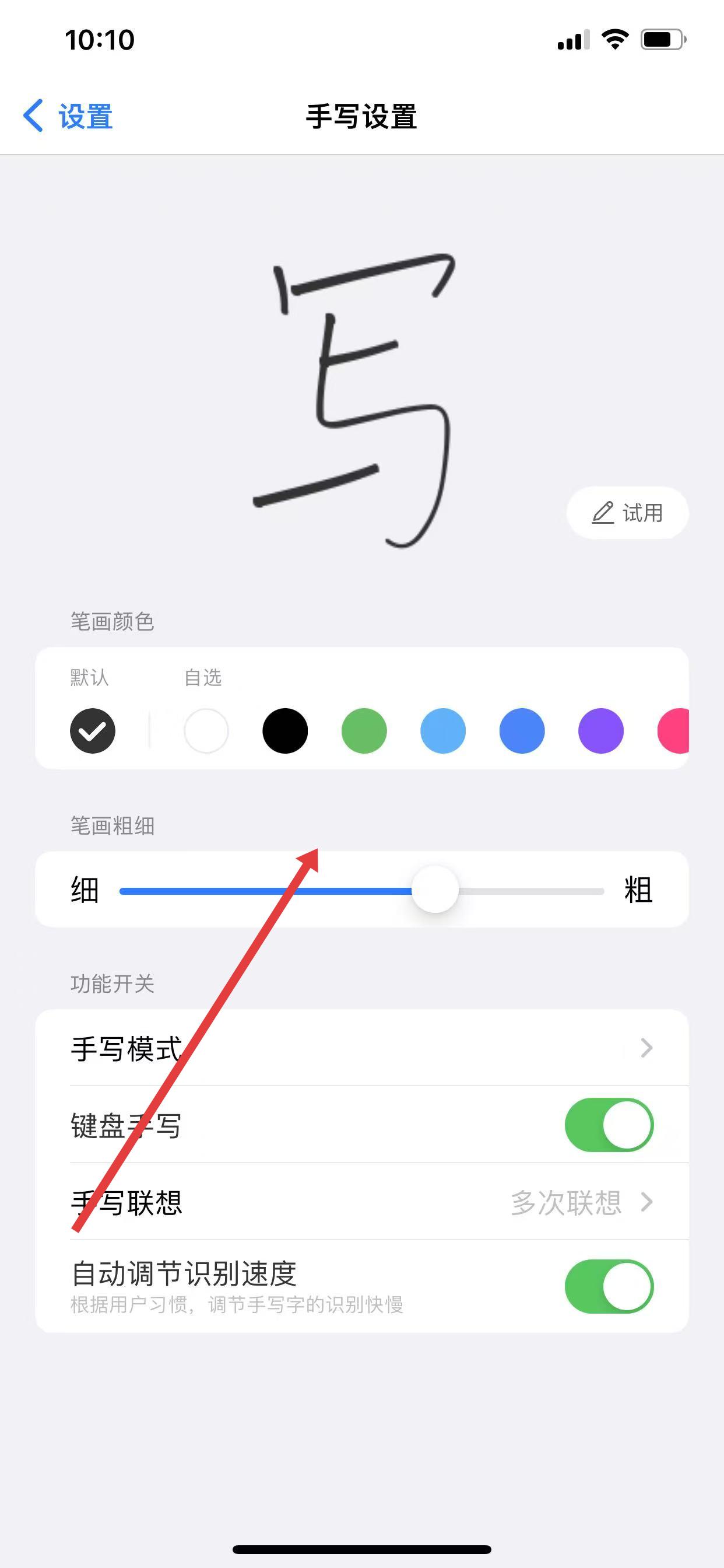 3、設(shè)置完成后,在手寫輸入界面,就能用設(shè)置好顏色的筆跡進(jìn)行手寫輸入。