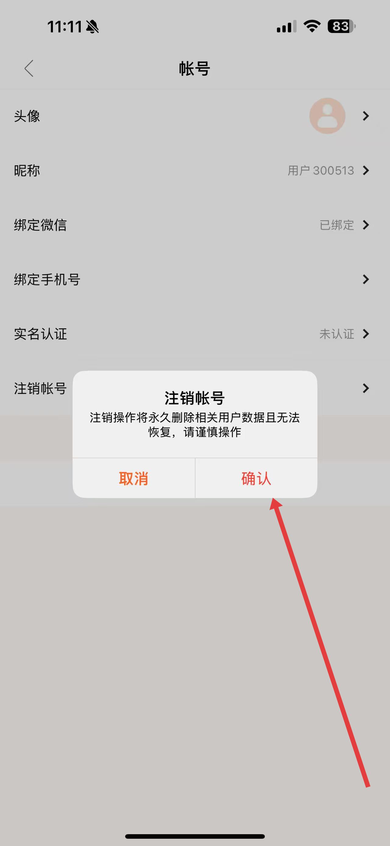 4、在彈出的確認提示框中,仔細閱讀提示內(nèi)容,確認注銷操作將永久刪除相關(guān)用戶數(shù)據(jù)且無法恢復,點擊確認,即可完成賬號注銷。