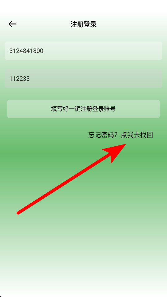 3、在注冊登錄頁面,點(diǎn)擊忘記密碼,點(diǎn)我去找回選項(xiàng),進(jìn)入找回密碼界面。