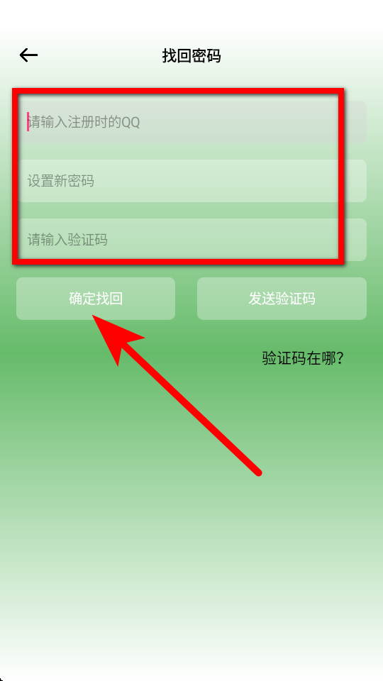 4、在找回密碼界面,依次輸入信息,點(diǎn)擊確定找回,即可完成密碼找回操作。