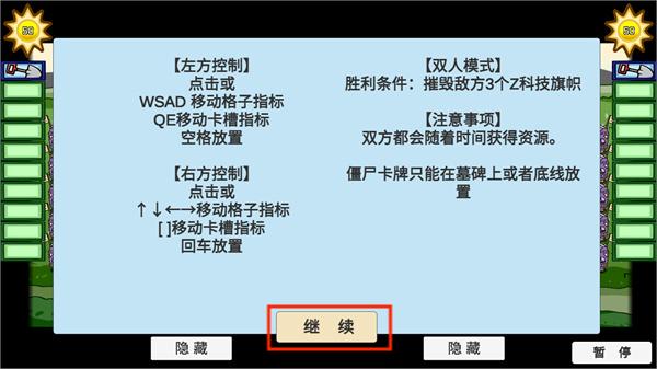 2、閱讀有關(guān)雙人模式的勝利條件、注意事項(xiàng)以及控制方式,點(diǎn)擊繼續(xù);