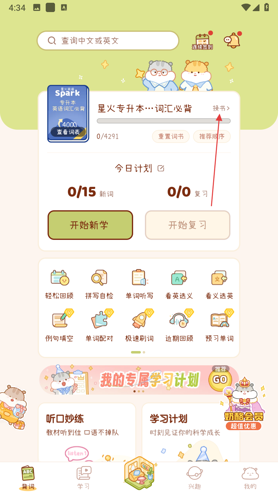 1、打開奶酪單詞APP,在背詞頁面點(diǎn)擊當(dāng)前詞書右側(cè)的換書按鈕。
