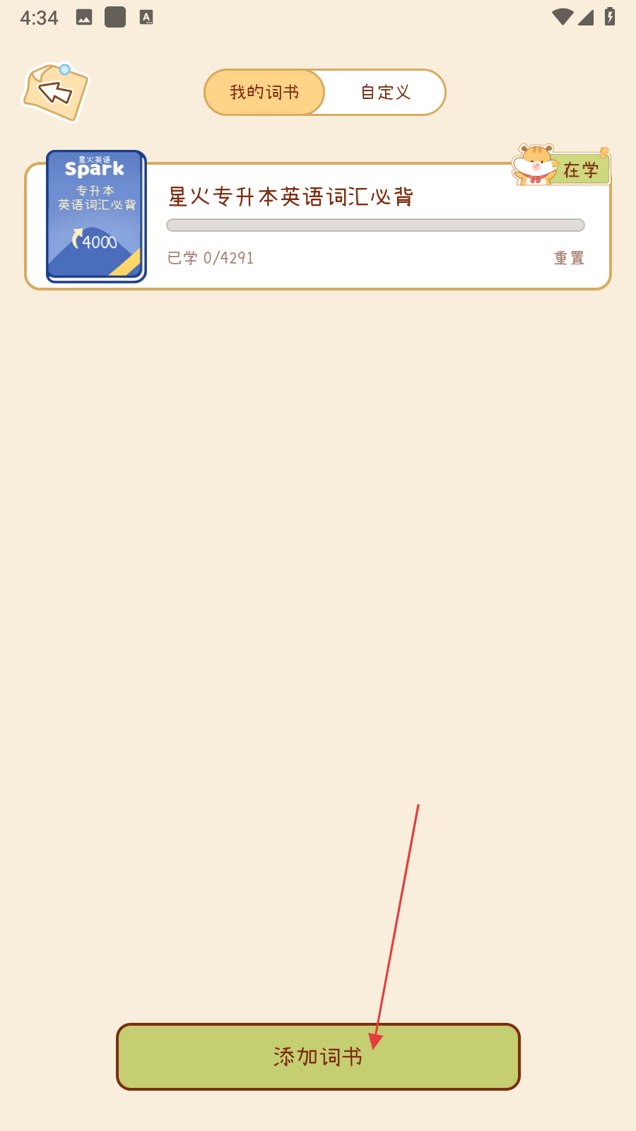2、進(jìn)入我的詞書界面后,點(diǎn)擊頁面下方的添加詞書按鈕。