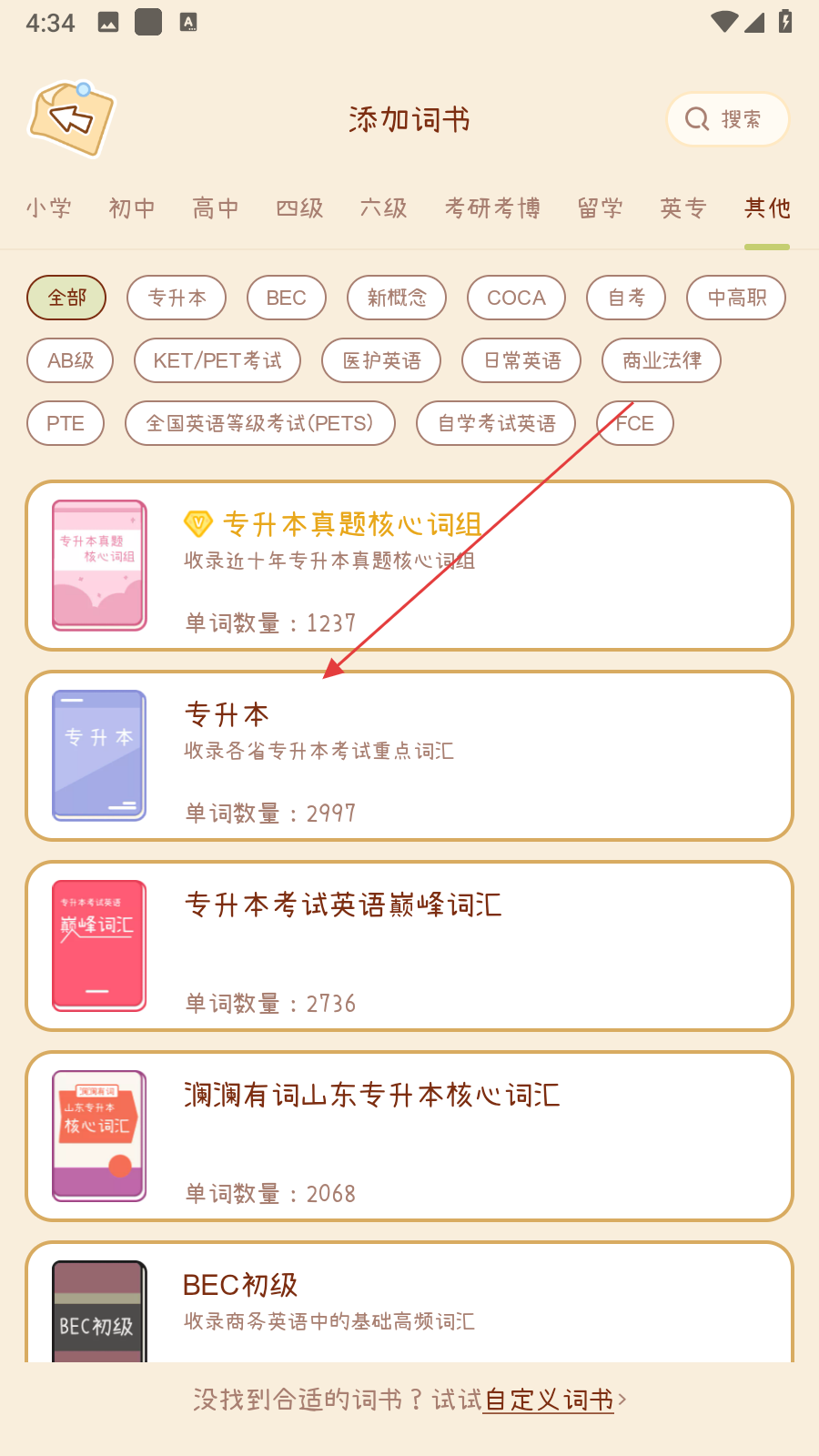 3、在添加詞書頁面,瀏覽或搜索找到想要更換的課本,點(diǎn)擊該詞書。