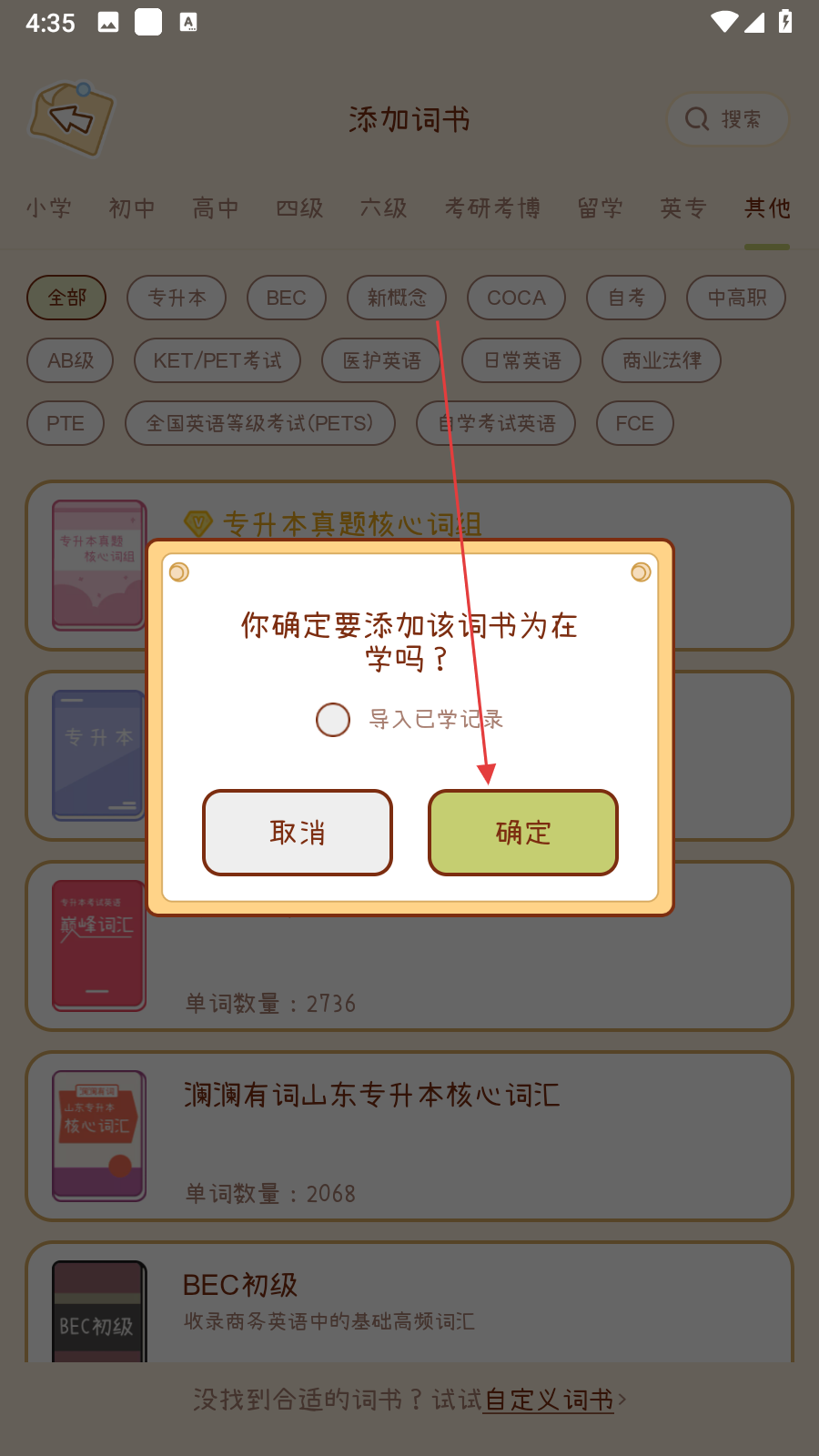 4、在彈出的確認(rèn)窗口中,點(diǎn)擊確定,即可將該課本添加為在學(xué)詞書。