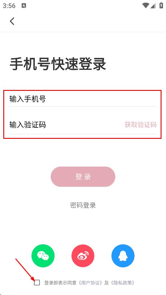 4、在手機號快速登錄界面,勾選登錄即表示同意用戶協(xié)議,再進行后續(xù)登錄操作。
