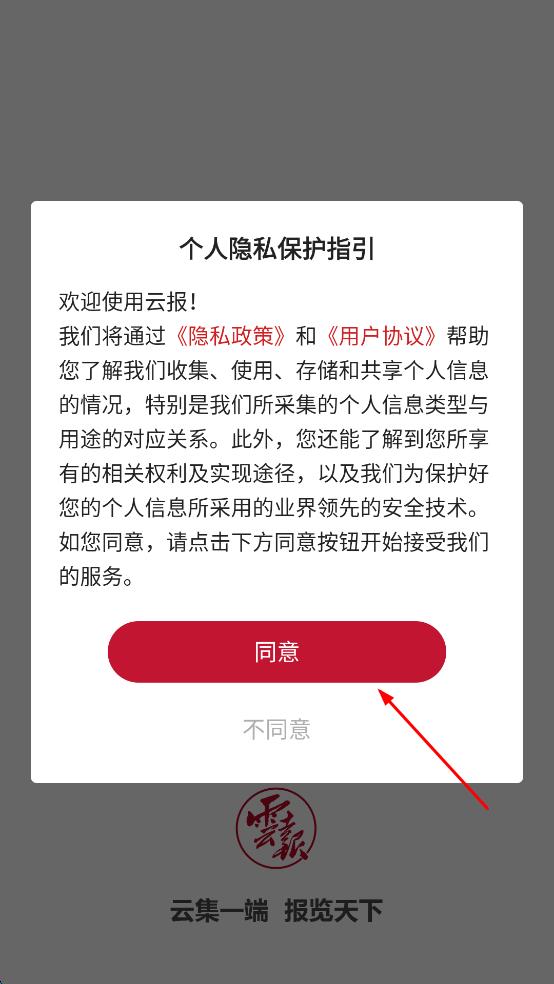 1、打開云報APP,在彈出的個人隱私保護指引頁面,點擊同意按鈕,開始接受服務。