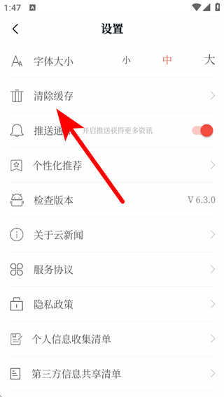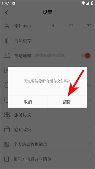 3、在設置頁面點擊清除緩存,彈出確定要清除所有緩存文件嗎的確認框。