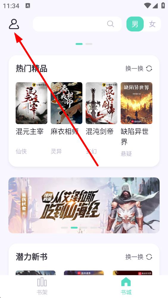 1、首先打開(kāi)熒光小說(shuō)APP,點(diǎn)擊左上角人像圖標(biāo)進(jìn)入個(gè)人界面。