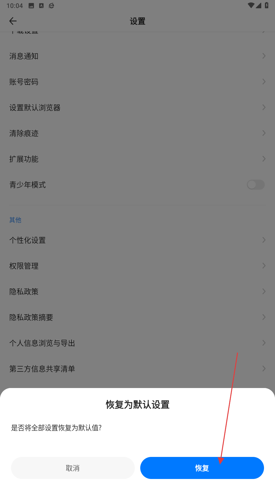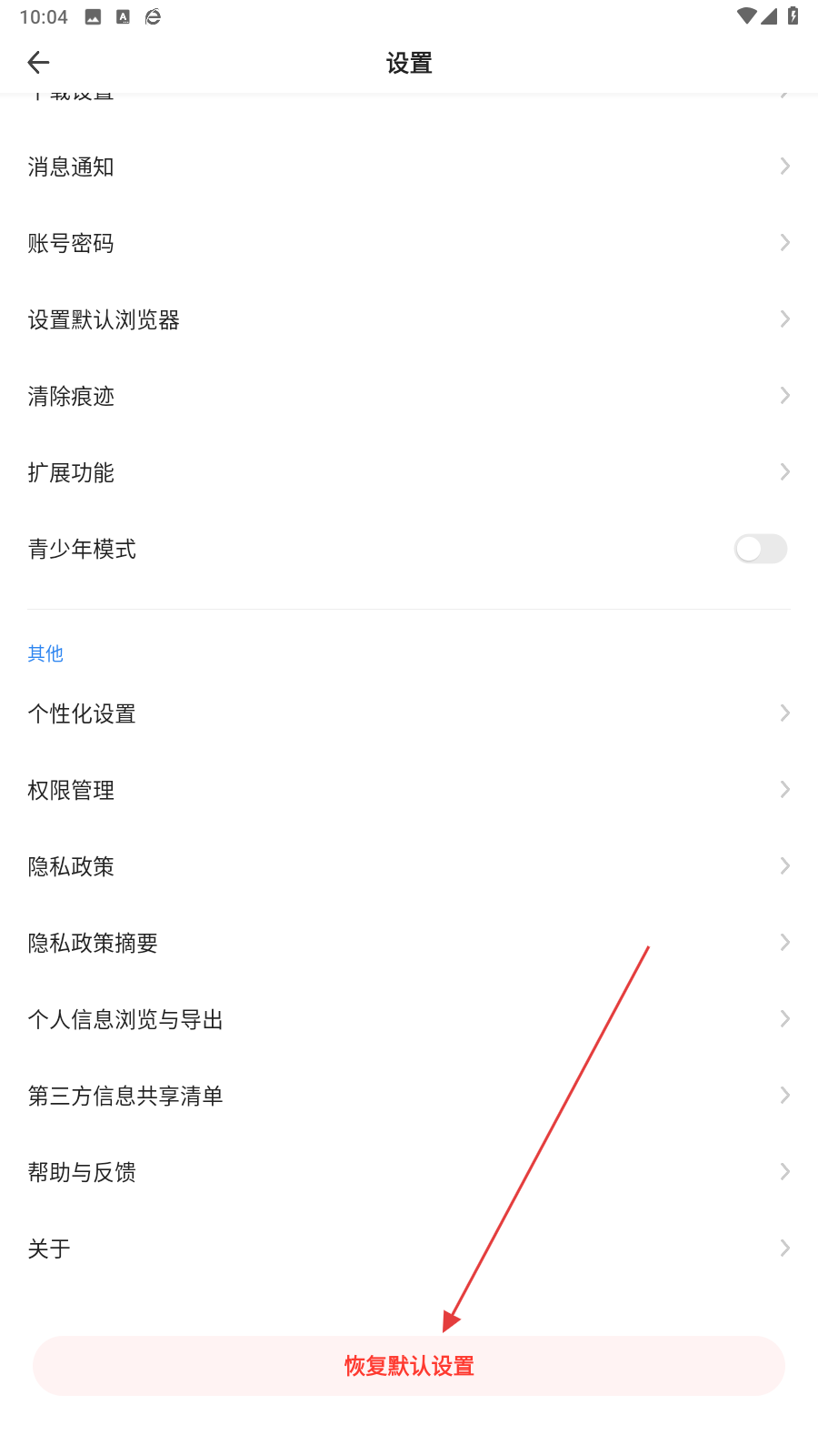 3、進(jìn)入設(shè)置頁(yè)面,向下滑動(dòng)找到并點(diǎn)擊恢復(fù)默認(rèn)設(shè)置。