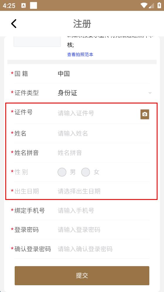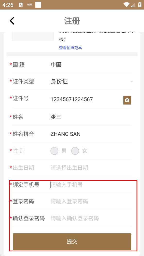 3、在對(duì)應(yīng)輸入框依次輸入證件號(hào)、姓名、姓名拼音,選擇性別和出生日期。