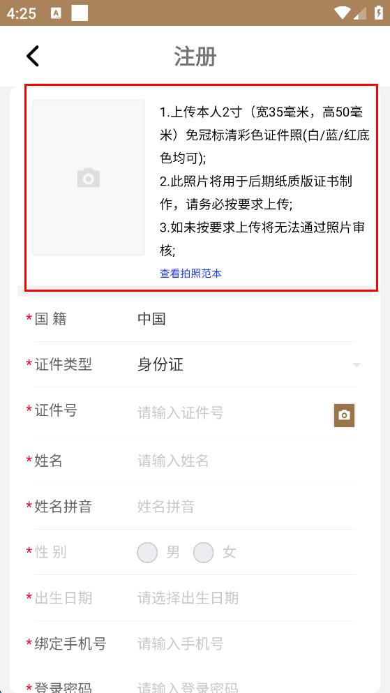 2、進(jìn)入注冊(cè)頁(yè)面,按要求上傳本人2寸免冠標(biāo)清彩色證件照,設(shè)置國(guó)籍、證件類型等信息。