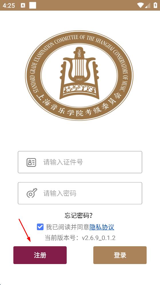 1、打開上海音樂(lè)學(xué)院考級(jí)軟件,在登錄頁(yè)面點(diǎn)擊“注冊(cè)”按鈕。
