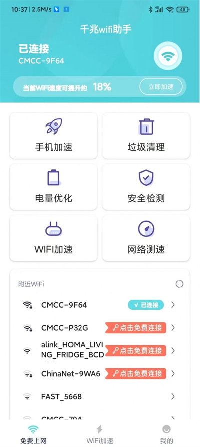 千兆wifi助手軟件是一款專門優(yōu)化安卓設(shè)備的軟件,可以對(duì)于網(wǎng)絡(luò)進(jìn)行直接的優(yōu)化和加速,解決部分網(wǎng)絡(luò)遇到的延遲和速度方面的問題,同時(shí)還包括很多功能,比如優(yōu)化電池等等,可以延遲相應(yīng)的電池或者是手機(jī)的壽命,還可以直接進(jìn)行緩存的清理,直接一鍵檢驗(yàn)即可查詢到這些問題,操作十分簡(jiǎn)單快捷,讓更多的垃圾軟件緩存都刪除,優(yōu)化手機(jī)讓手機(jī)更加的快速運(yùn)行。