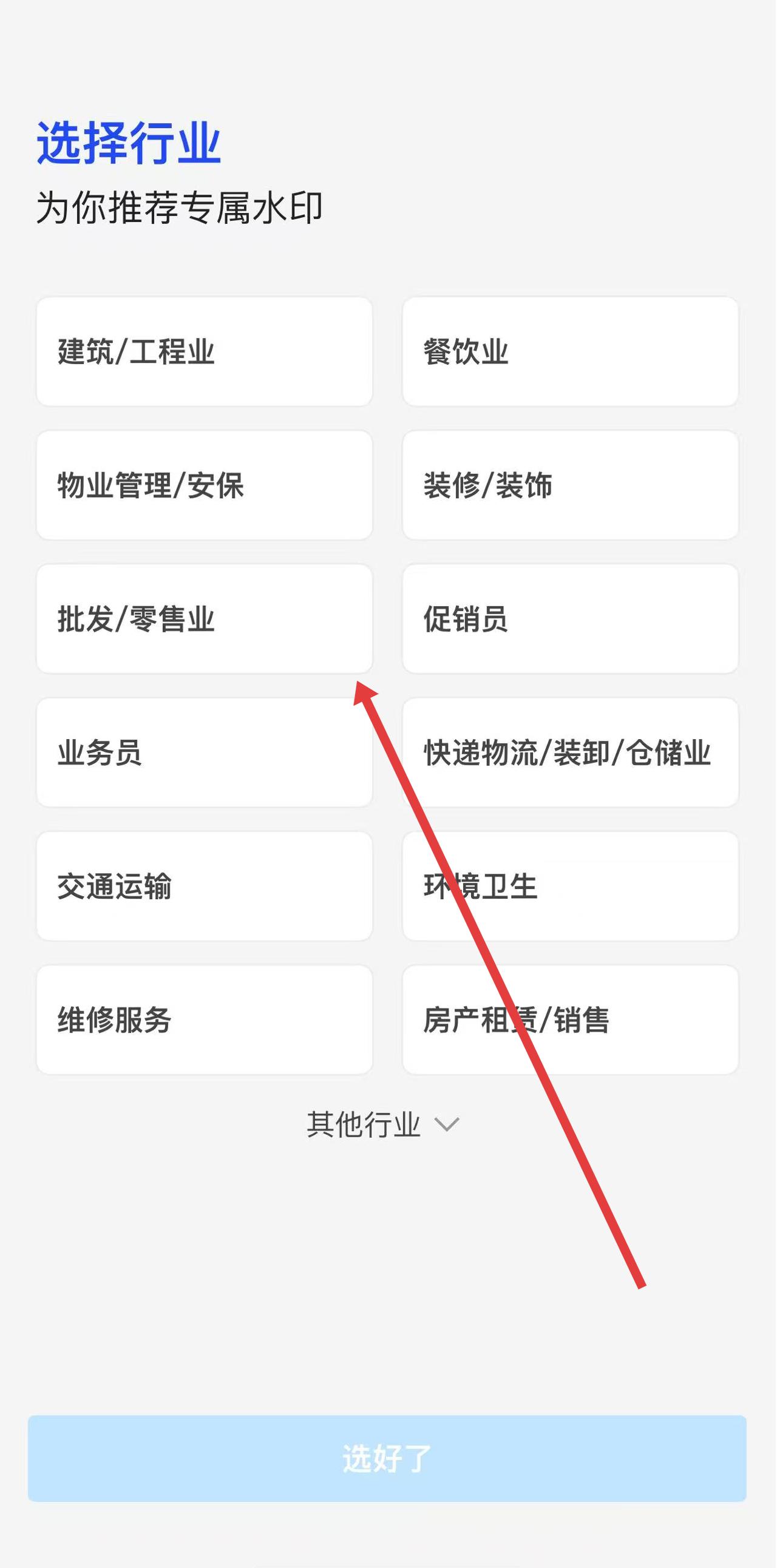 1、進入選擇行業(yè)頁面,根據(jù)自身所屬行業(yè),點擊對應(yīng)的行業(yè)選項,選好后點擊底部選好了按鈕,完成行業(yè)選擇流程。