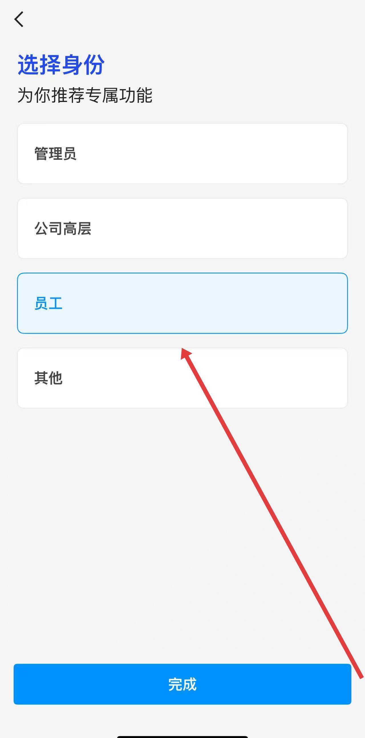 2、跳轉(zhuǎn)至選擇身份頁面,依據(jù)實際身份情況,選定對應(yīng)身份,隨后點擊頁面下方藍(lán)色的完成按鈕,結(jié)束身份選擇操作。