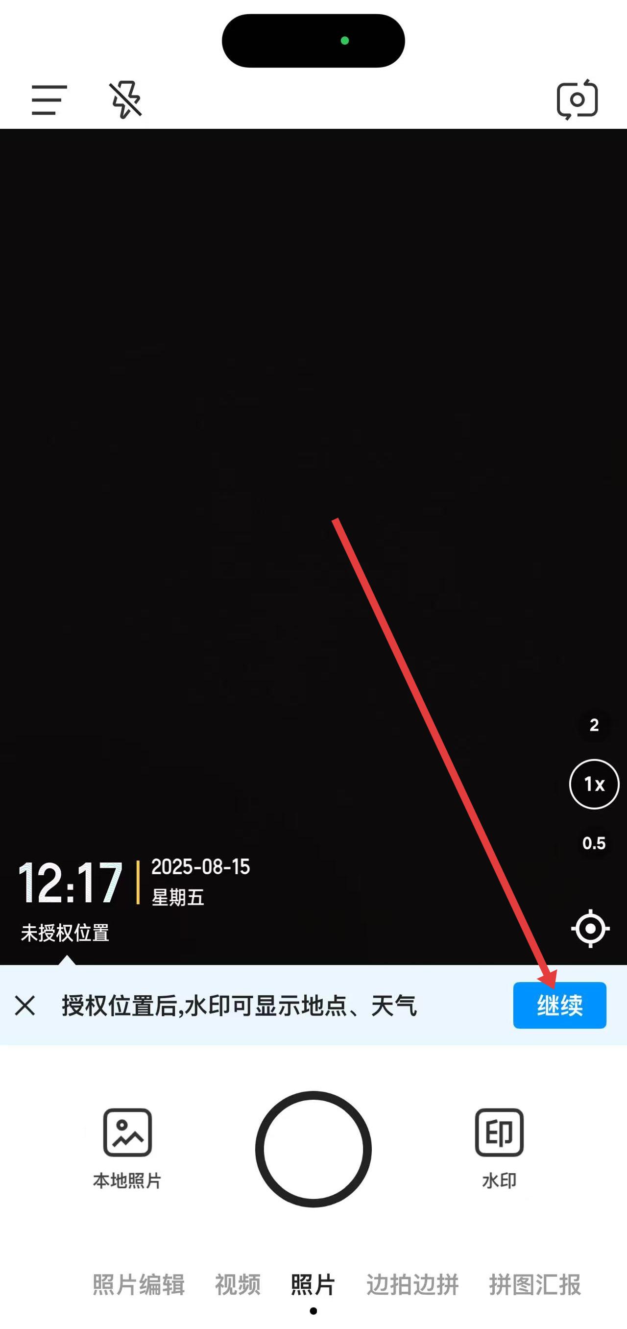 3、進入照片拍攝界面,底部彈出提示授權(quán)位置后,按照指引完成位置授權(quán),直接進行拍攝或其他操作。