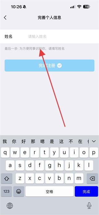 2、進入完善個人信息頁面,在姓名欄輸入姓名后,點擊完成注冊。