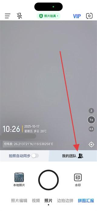 1、打開今日水印照相機APP,點擊拍攝界面右下角的我的團隊。