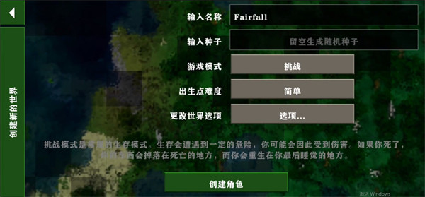 3、輸入世界的名字,還有游戲難度、其他的選項(xiàng)都可以設(shè)定,然后點(diǎn)擊【創(chuàng)建角色】完成創(chuàng)建;