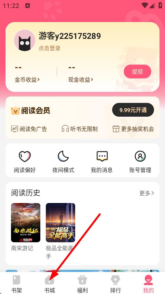 1、打開喵爪小說App,點(diǎn)擊底部導(dǎo)航欄中的書城選項(xiàng),進(jìn)入書城頁面。