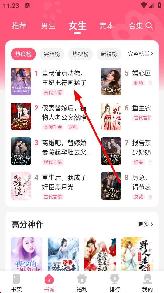 2、在書城頁面,根據(jù)分類如女生頻道的熱度榜找到想收聽的小說,點(diǎn)擊小說封面進(jìn)入小說詳情頁。