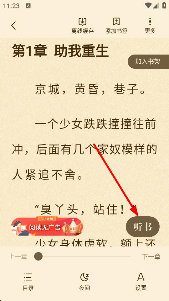 4、在小說閱讀界面,點(diǎn)擊屏幕找到聽書按鈕,點(diǎn)擊該按鈕,即可開始收聽小說。