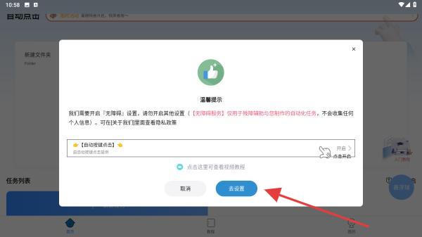 2、彈出溫馨提示窗口,點(diǎn)擊去設(shè)置按鈕,找到自動(dòng)按鍵點(diǎn)擊相關(guān)選項(xiàng)并開(kāi)啟權(quán)限。