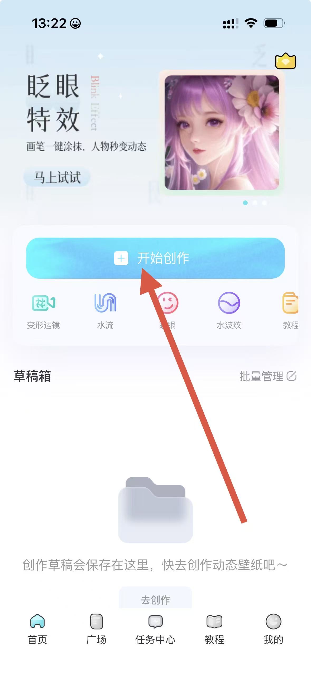 1、打開創(chuàng)作類APP,點(diǎn)擊開始創(chuàng)作按鈕,進(jìn)入創(chuàng)作界面。