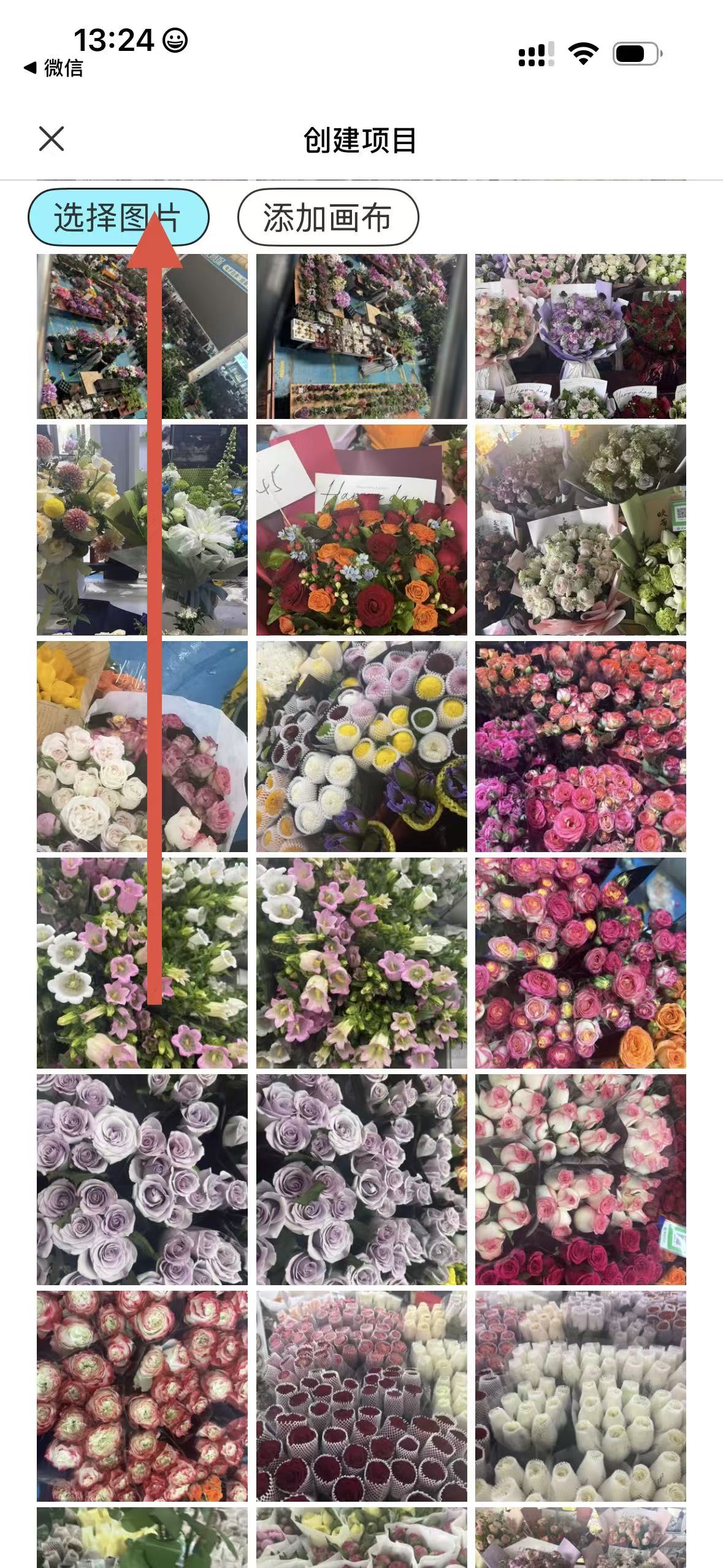 2、在創(chuàng)建項(xiàng)目頁面,選擇選擇圖片,從相冊(cè)中挑選想要?jiǎng)?chuàng)作的圖片。